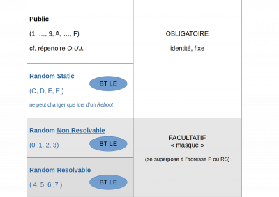 - 4, 5, 6, 7 : adresse “aléatoire résolvable” : une adresse de ce type change aléatoirement toutes les 10-15 min mais l'identité de l'appareil peut être reconnue par les dispositifs qui détiennent une clé de décryptage spécifique.